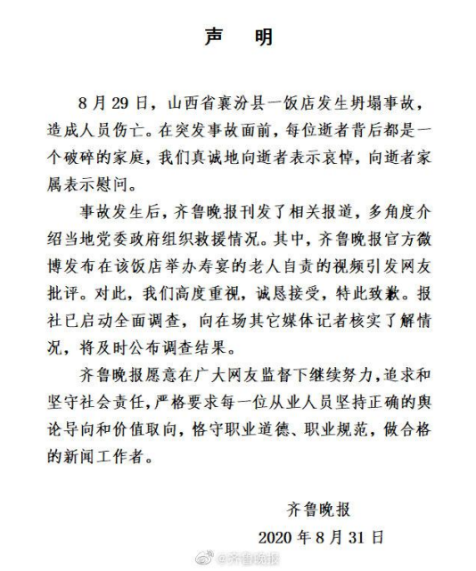 事故发生后,齐鲁晚报刊发了相关报道,多角度介绍当地党委政府组织救援情况。其中,齐鲁晚报官方微博发布在该饭店举办寿宴的老人自责的视频引发网友批评。对此,我们高度重视,诚恳接受,特此致歉。报社已启动全面调查,向在场其它媒体记者核实了解情况,将及时公布调查结果。