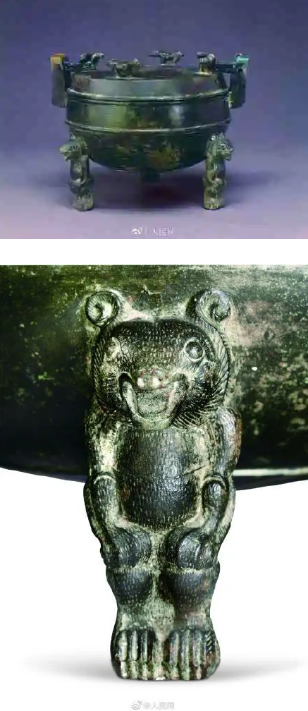 河北保定满城汉墓出土的一口熊足铜鼎,因构思巧妙被称为“古代的高压锅”。熊足铜鼎器身呈椭圆球形,鼎的三足为蹲立状的小熊,咧口微笑,模样十分娇憨可爱。鼎盖上还环立着四个小兽。